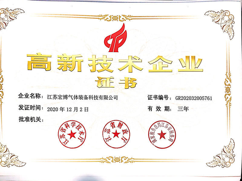 2020年,宏博企業(yè)江蘇宏博氣體裝備科技有限公司,生產(chǎn)基地-東臺宏博凈化科技有限公司同時(shí)獲評高新技術(shù)企業(yè),并于近日收到由江蘇省科學(xué)技術(shù)廳、江蘇省財(cái)政廳、國家稅務(wù)總局江蘇省稅務(wù)局聯(lián)合頒發(fā)的《高新技術(shù)企業(yè)證書》。